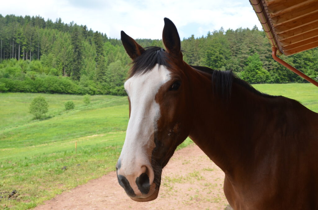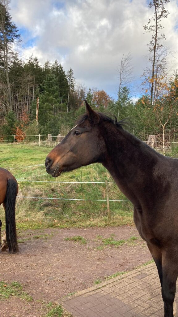 Hi, ich bin Karo, die Rheinländer Stute hier auf dem Hof. Meine Vergangenheit war nicht leicht, und ich habe viel durchgemacht. Ein eingewachsener Zahn in meiner Backe hat mir große Schmerzen bereitet, und wegen der schlechten Pflege meiner Vorbesitzerin war ich unter- und fehlernährt. Mein Gebiss konnte sich nicht richtig entwickeln, weil mir die wichtigen Mineralstoffe fehlten. Als ich schließlich hierherkam, konnte die Zahnbehandlung nur direkt auf einem Feldweg durchgeführt werden, weil ich nie gelernt hatte, in einen Pferdehänger zu steigen. ( Auwai, und jetzt muss ich mich meiner Zahnarztangst wohl stellen, da dummerweise einige Zahnarzt:innen im Verein sind =))