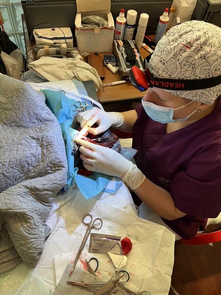 Eine Katze litt an einer sogenannten Pyometra – einer eitrigen Gebärmutterentzündung. Die Gebärmutter füllt sich mit Eiter, das Tier wird schwer krank, bekommt Fieber, frisst nicht mehr. Ohne Operation endet das fast immer tödlich. Durch die sofortige Entfernung der entzündeten Gebärmutter konnten wir ihr Leben retten.